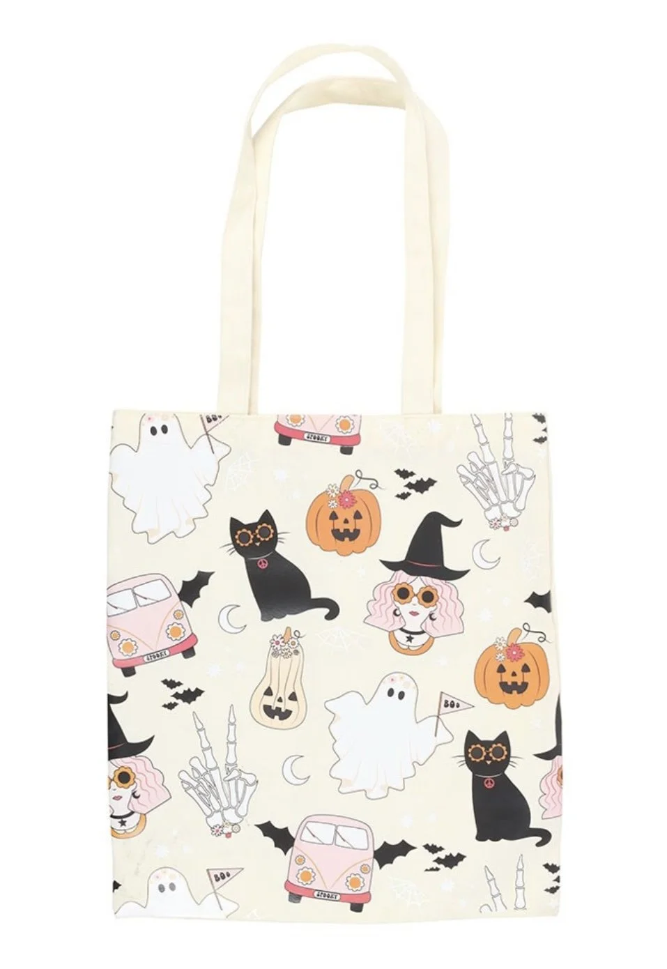 Carry your essentials in spooky style with this polycotton tote bag, featuring a groovy Halloween-inspired design. Perfect for shopping trips, work, or adding a touch of Halloween flair to your daily errands, this lightweight bag is versatile and a great gift for anyone who loves quirky accessories. 98% polyester, 2% cotton.