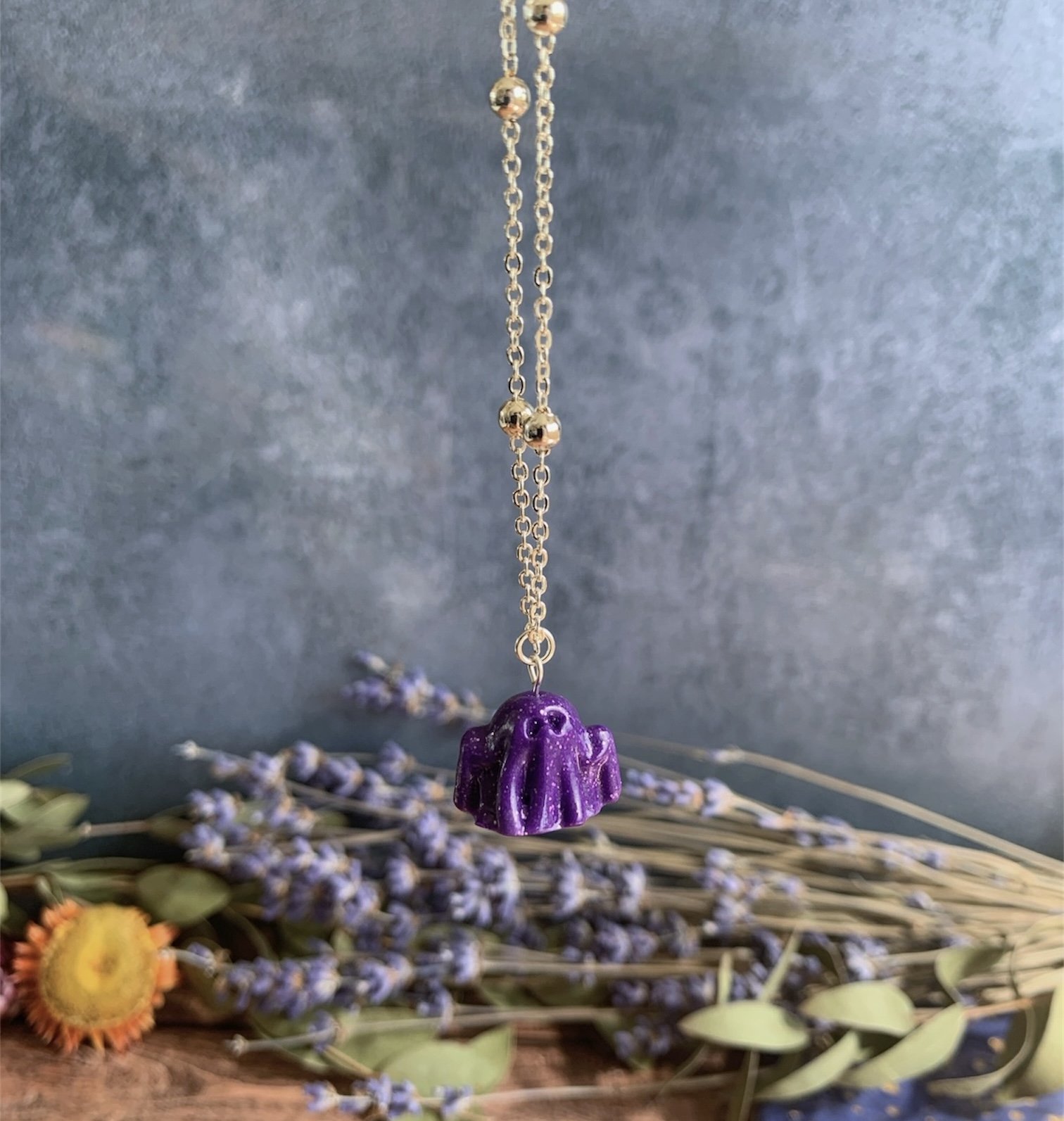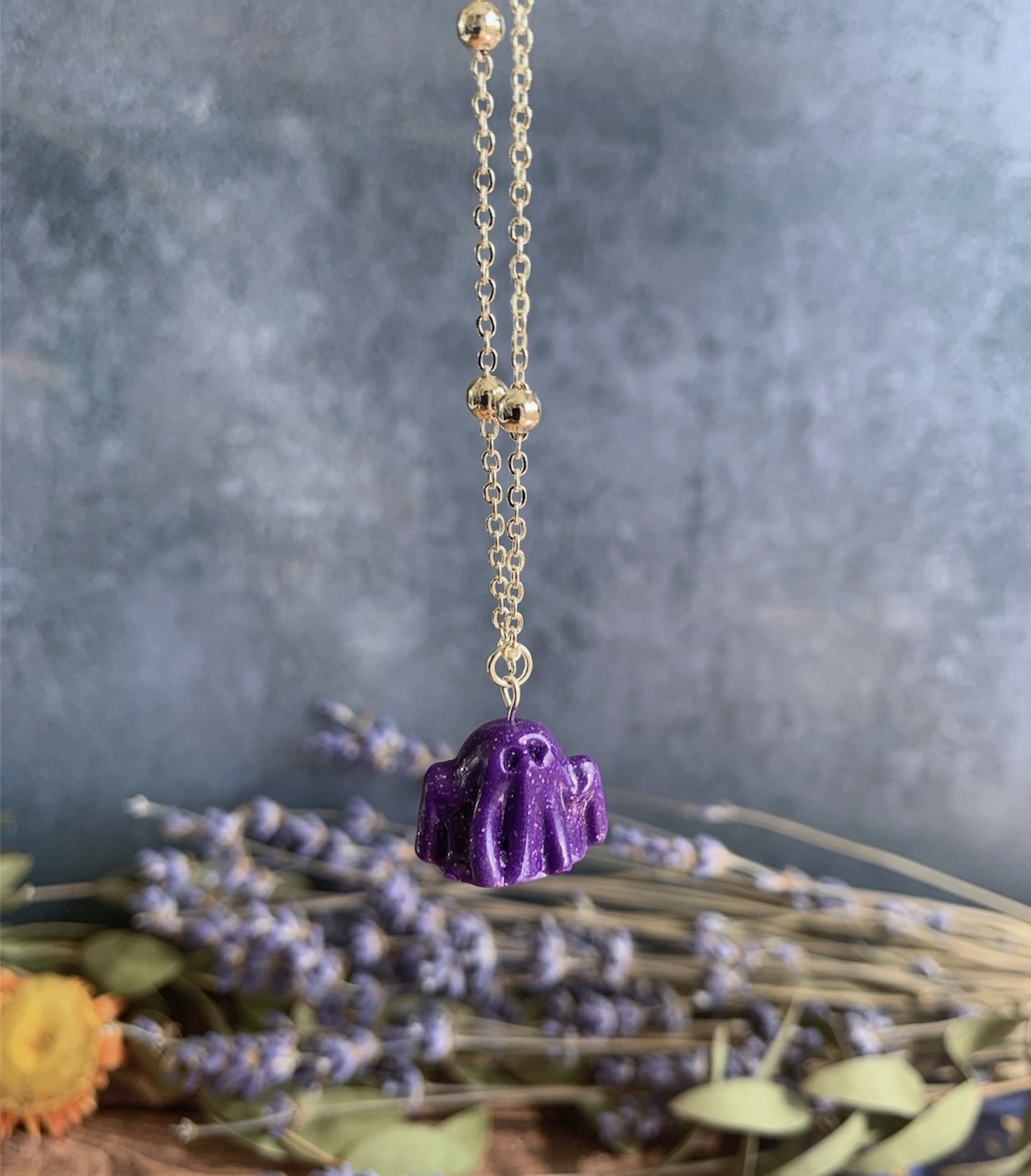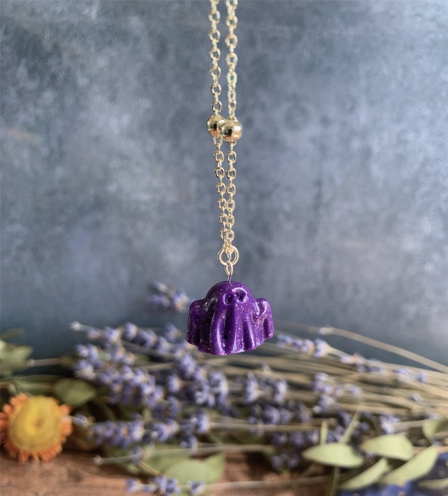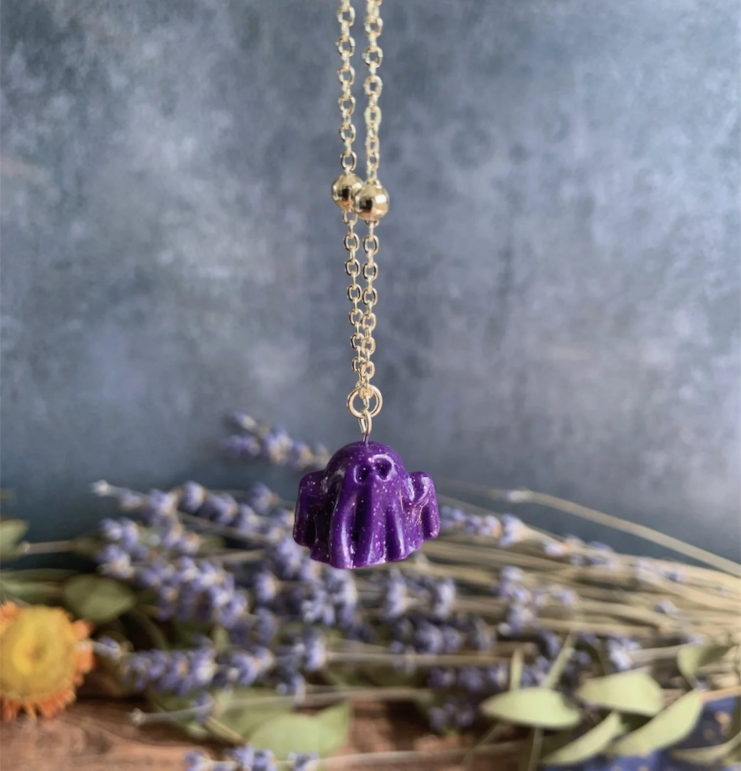 This adorable necklace has been made with the most gorgeous Purple Glitter Polymer Clay, shaped in to the cutest little spooky ghost. Varnished for a gloss effect. Comes on a Silver Plated 18” Ball Chain. Nickel Free.