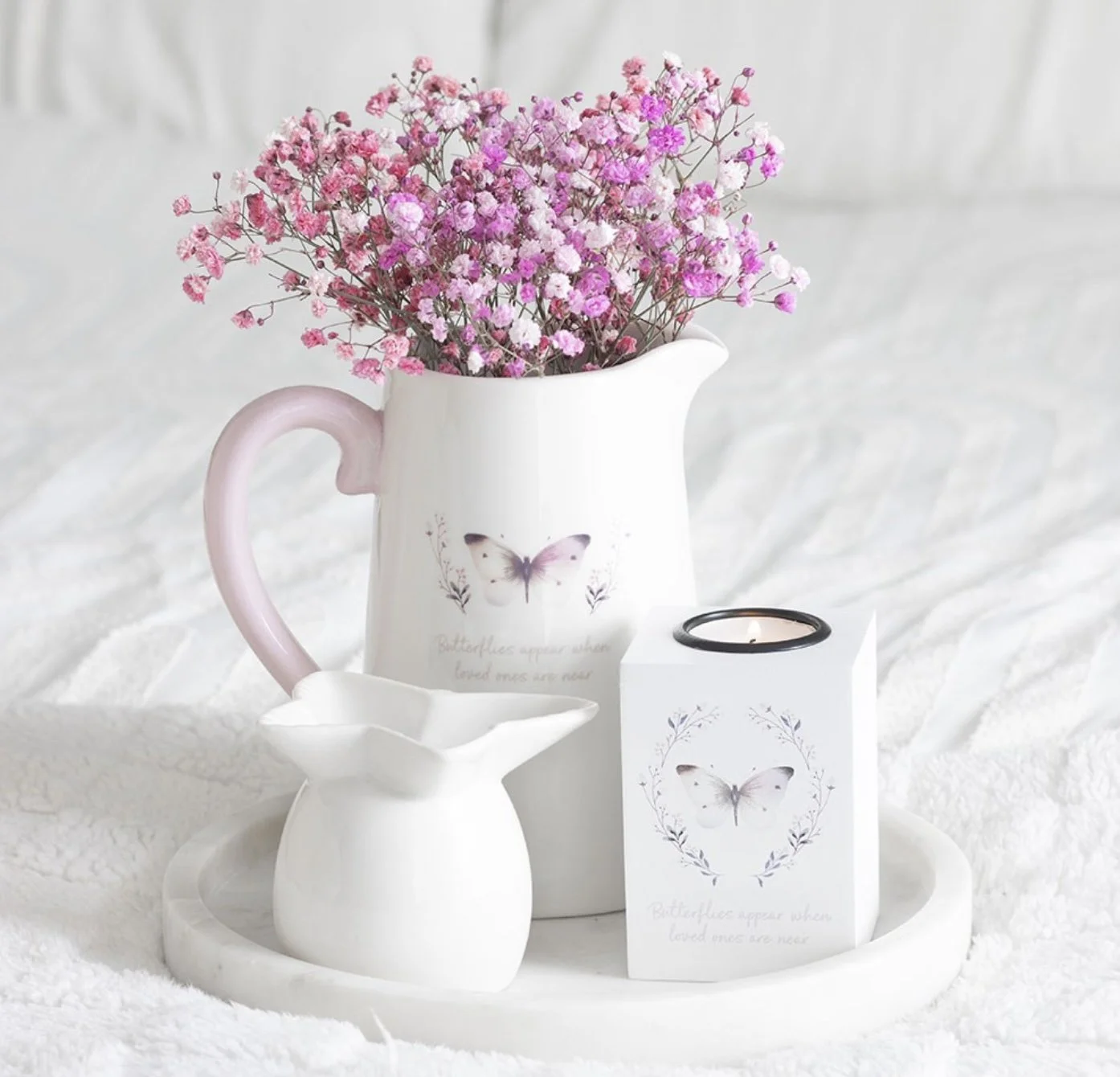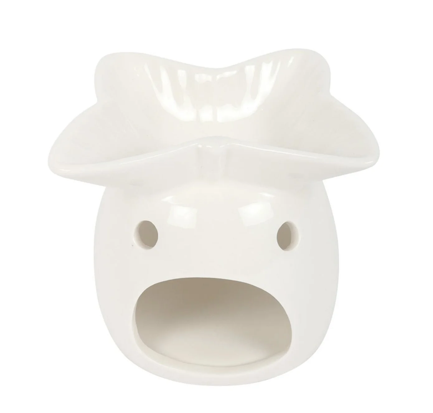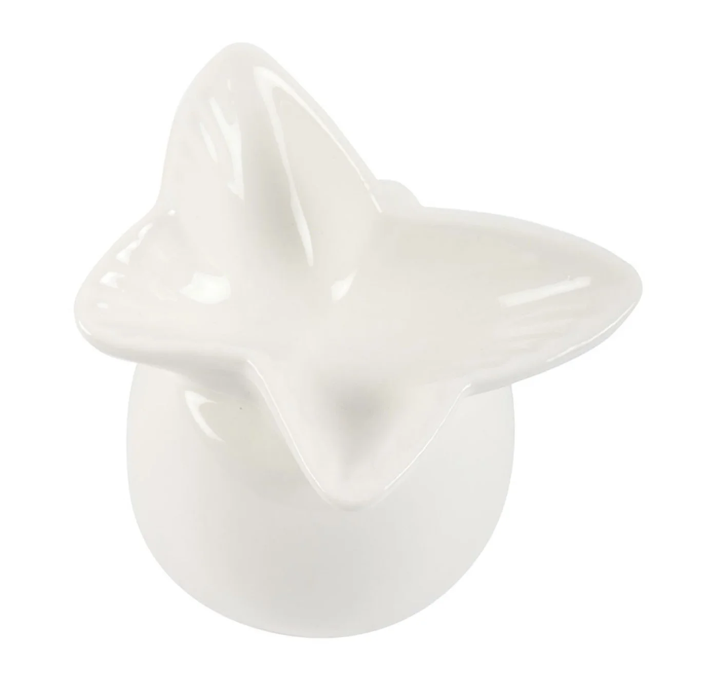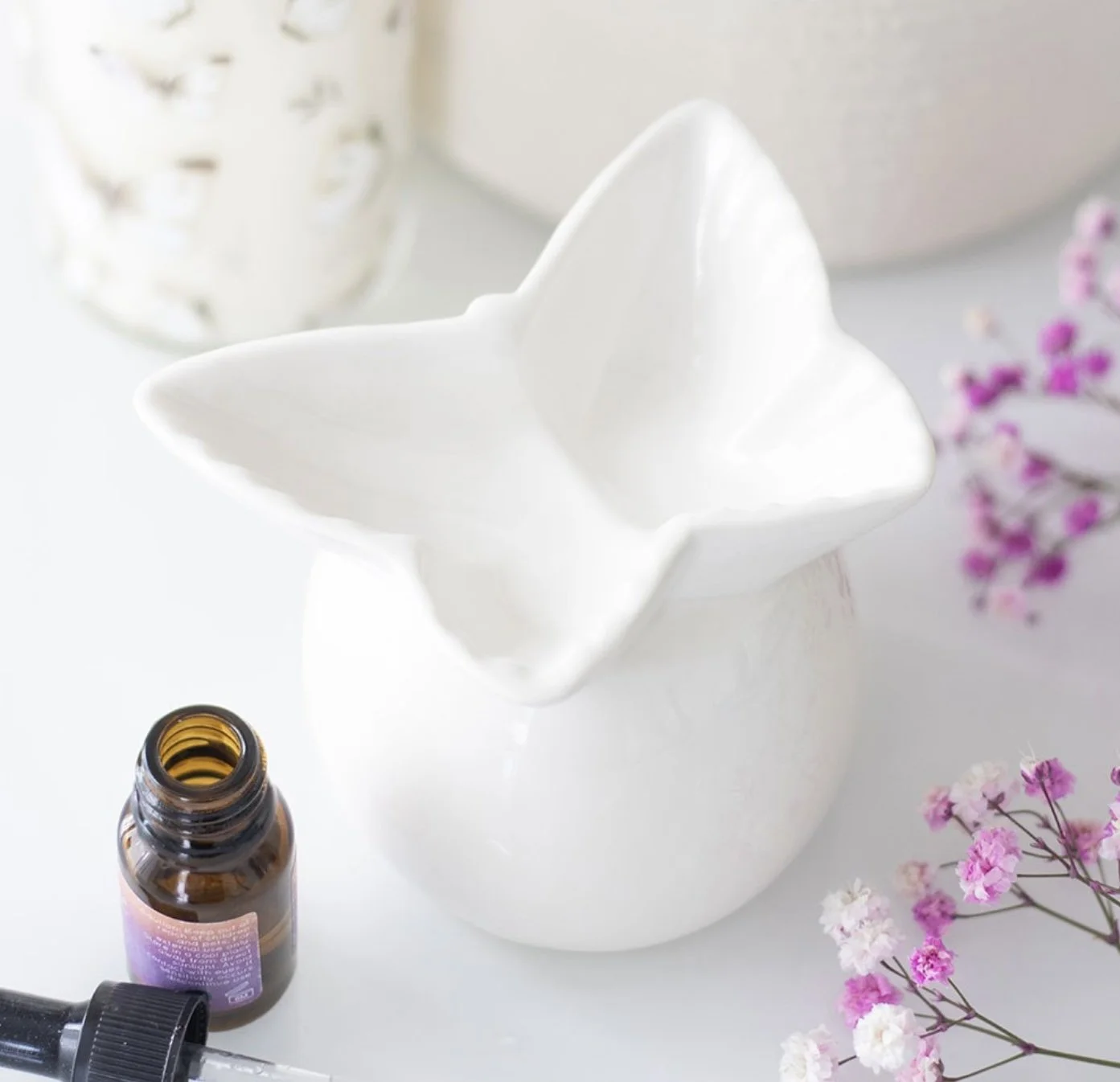 This elegant white ceramic oil burner features a butterfly-shaped bowl topper, adding a delicate decorative touch while holding fragrance oil during use. Designed in a soft, sculptural style with a classic silhouette, it's perfect for creating a calming and thoughtful atmosphere in the home. Recommended for use with fragrance oil diluted with water. Never use undiluted oil. Never leave a lit candle unattended.