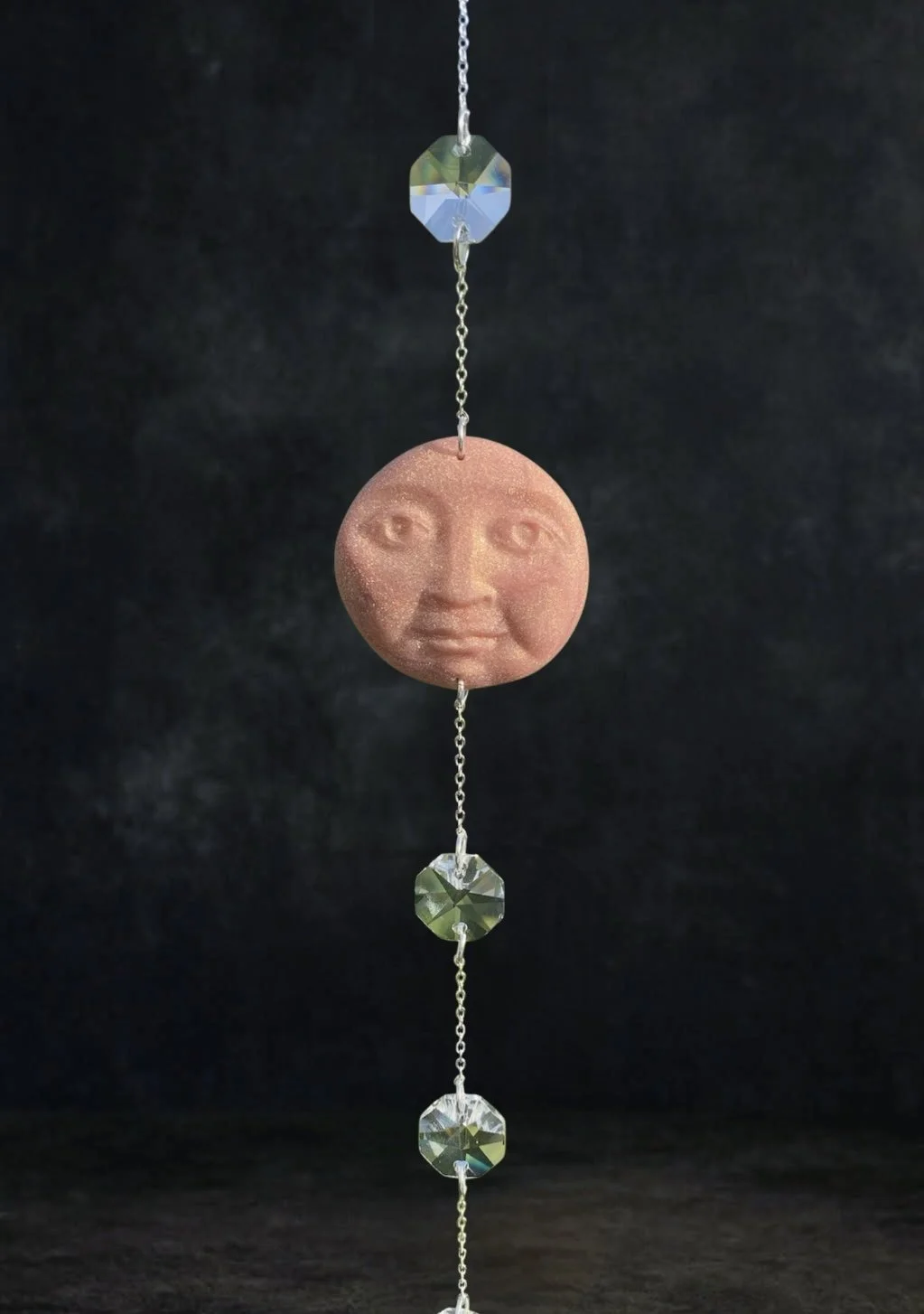 This gorgeous whimsical suncatcher has been handmade with the most stunning glitter rose gold polymer clay. Finished in a rustic, matte effect. Descending from the Moon Face are Hexagon crystal beads. Finished with a gorgeous clear acrylic teardrop charm, depicting magical mushrooms & crescent moon. On a silver plated spiral hook. Moon Face measured approx 4cms wide. Hanging measures approx 34cms in length - including hook.