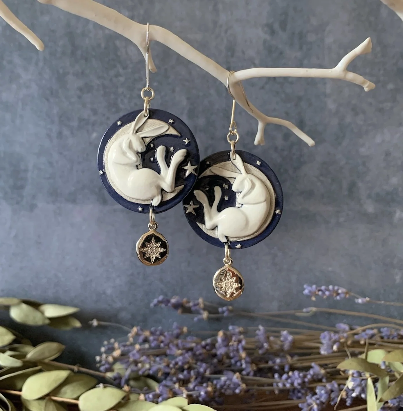 These gorgeous earrings are handmade from the most stunning dark blue polymer clay, hand painted & varnished to tell the tale of The Lepus. This beautiful piece depicts a sleeping hare amongst the starry nights sky & enchanting crescent moon. Hanging from the Clay Hares are the most decadent Platinum Plated brass North Star charms with cubic zirconia. Earrings hang from Silver Plated ear hooks. Nickel Free. Hares measure approx 3cms.