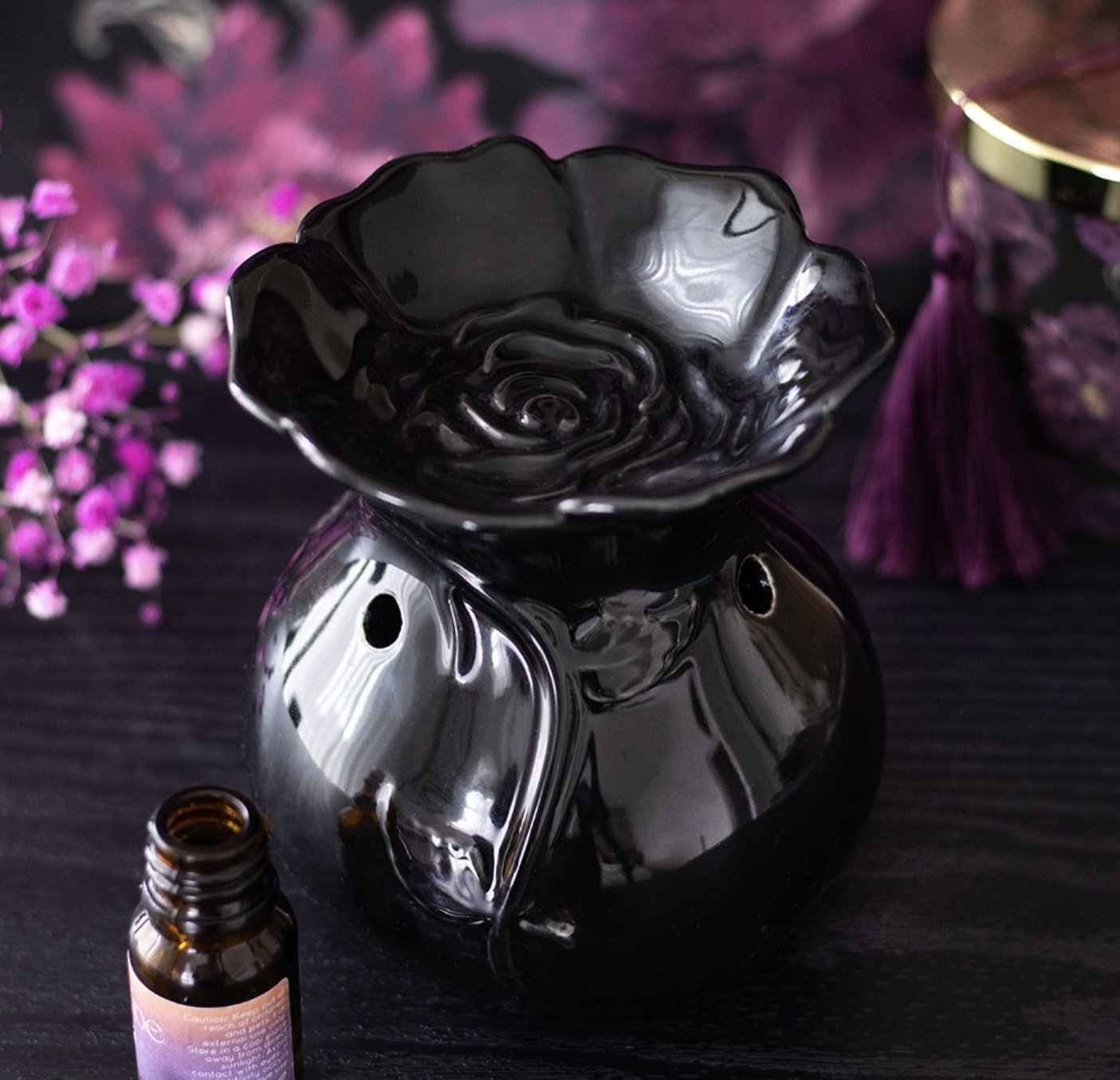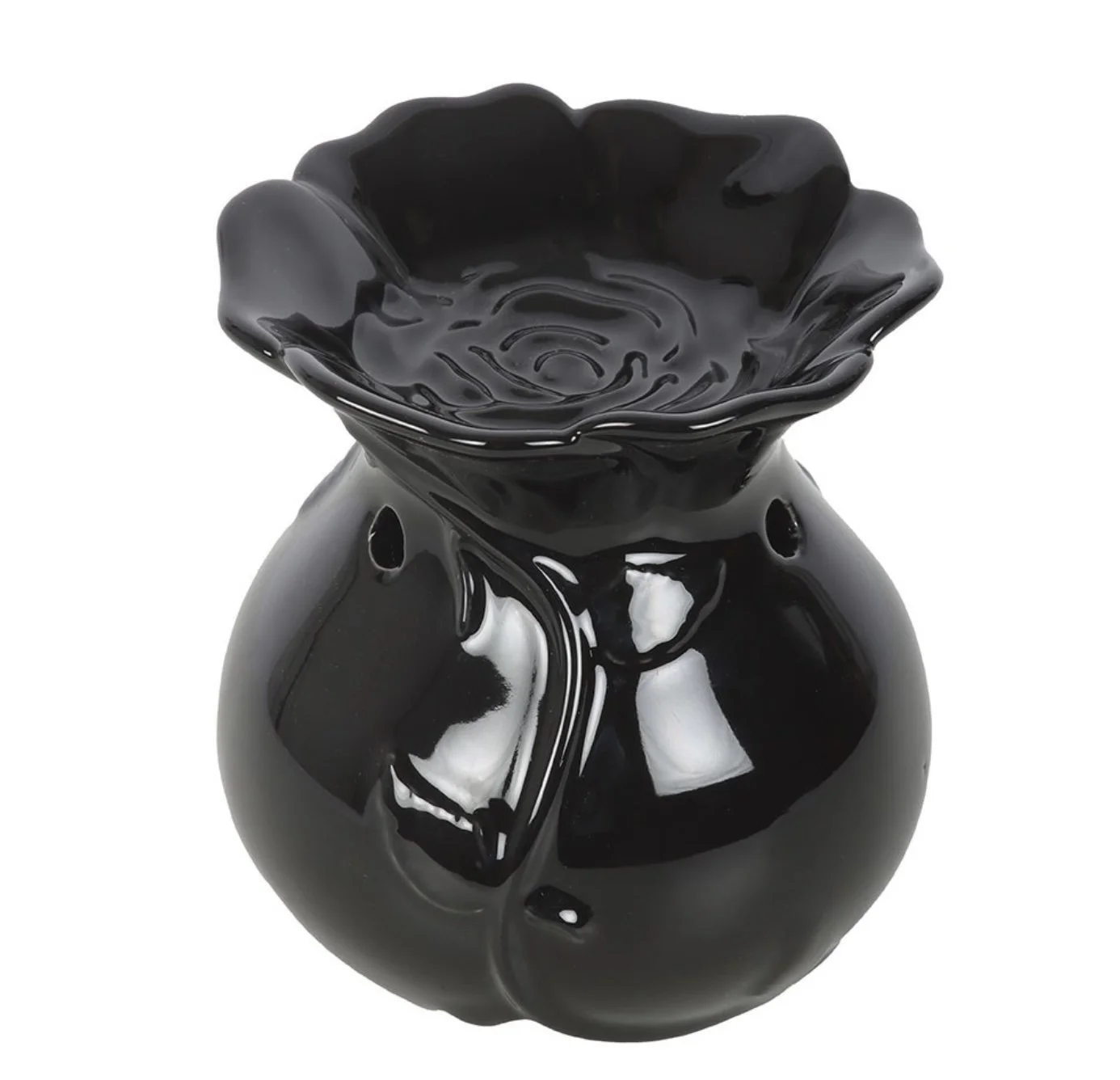 Exquisitely sculpted into the form of a dark rose in bloom, this ceramic oil burner is a captivating piece for scenting the home with your chosen fragrance oils. Simply place a tealight beneath and a few drops of diluted oil in the dish to summon your chosen atmosphere. Recommended for use with fragrance oil diluted with water. Never leave a lit candle unattended.