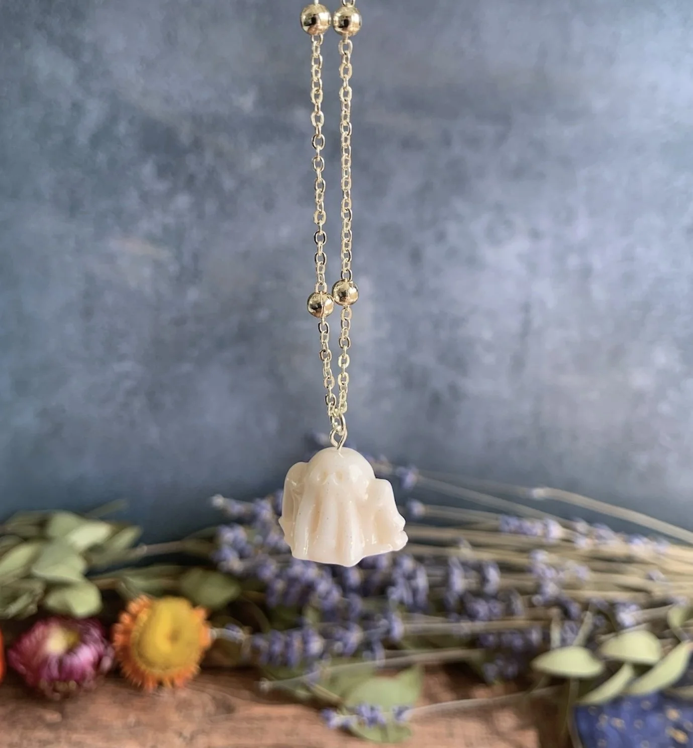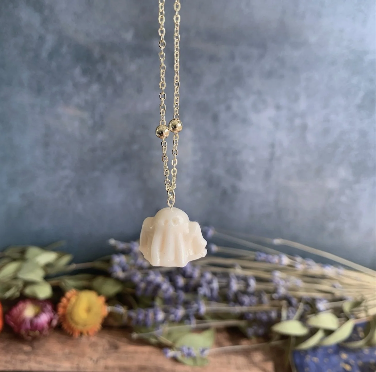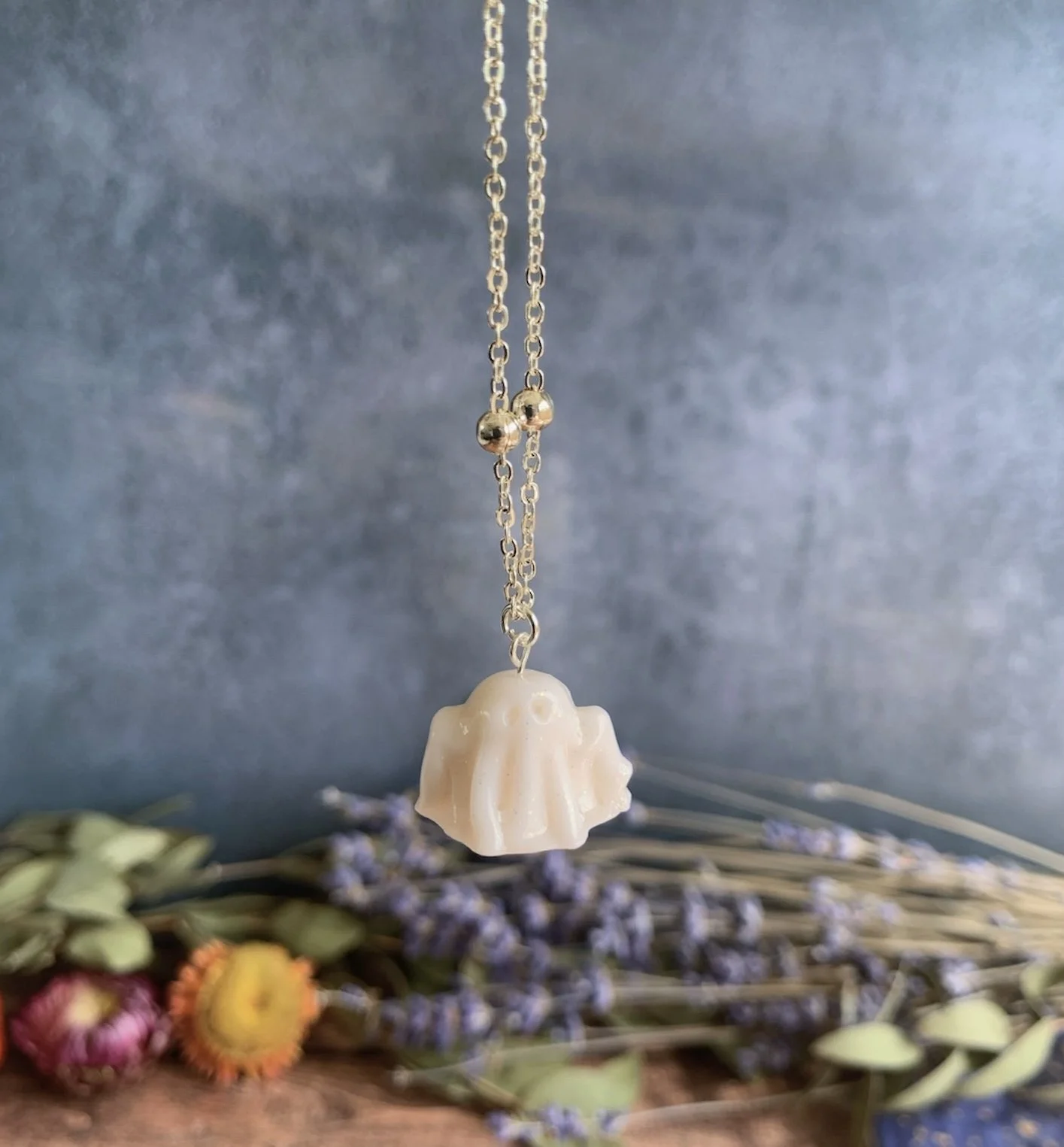This adorable necklace has been made with the most gorgeous White Glitter Polymer Clay, shaped in to the cutest little spooky ghost. Varnished for a gloss effect. Comes on a Silver Plated 18” Ball Chain. Nickel Free.