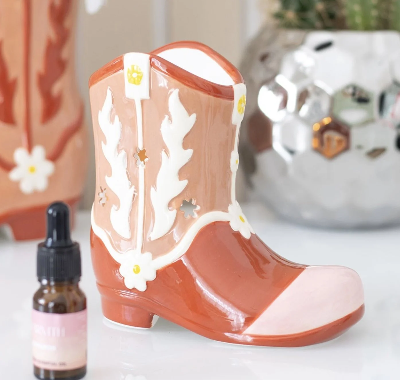 Saddle up your senses with this pink cowboy boot oil burner and wax warmer, perfect for wrangling sweet scents into your space! Ideal for any cowgirl at heart, it’s a unique accent piece that combines current trends with functionality. Compatible with diluted fragrance oils and wax melts.