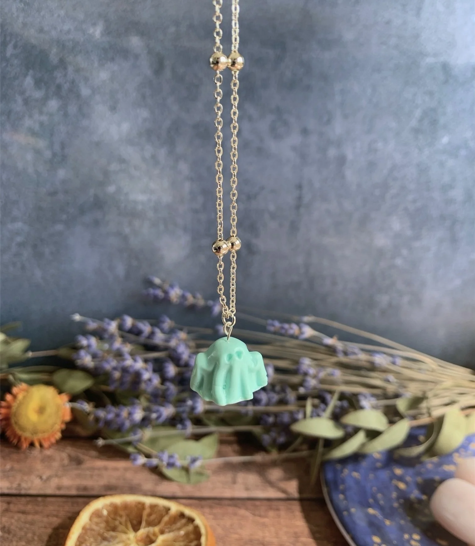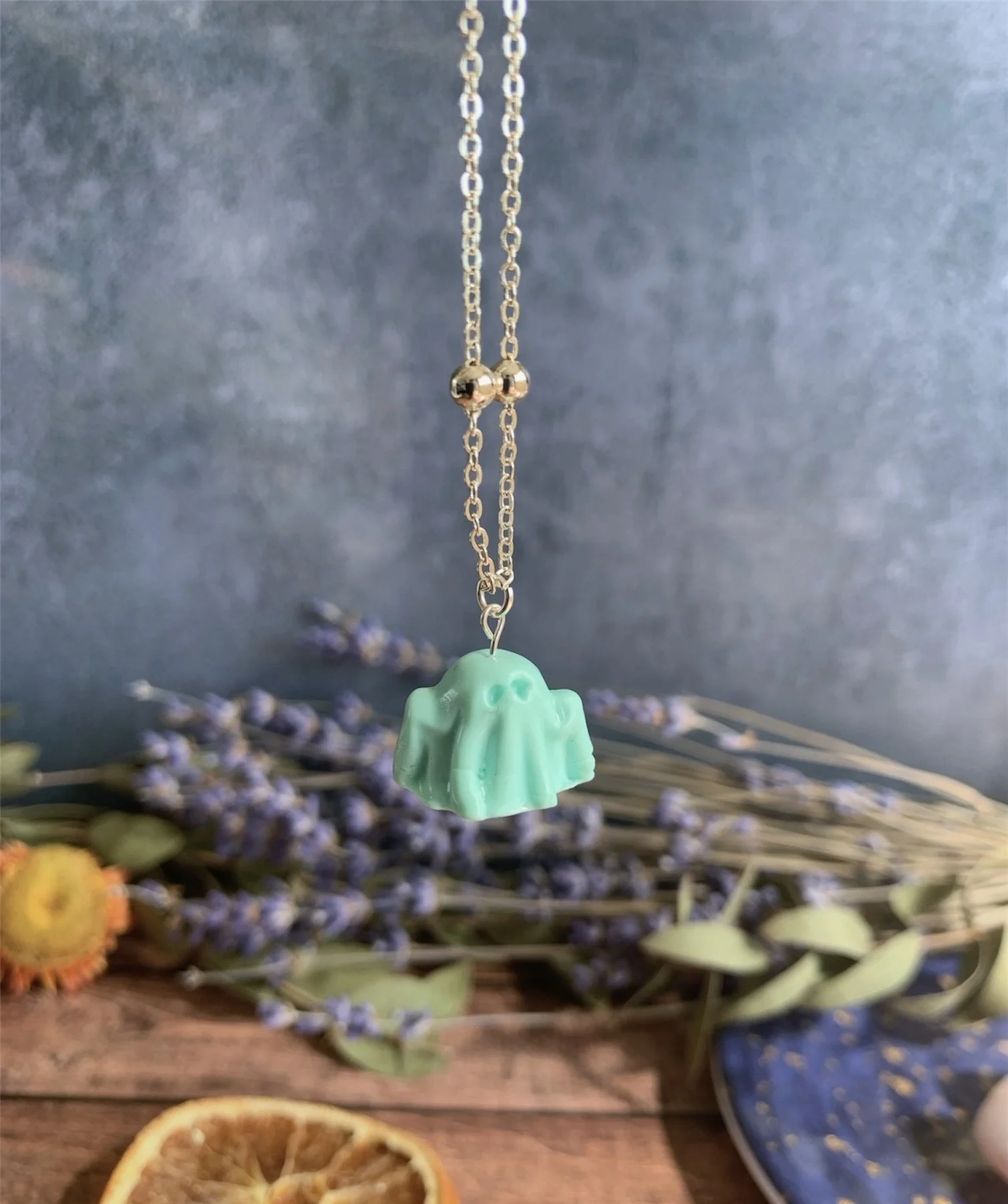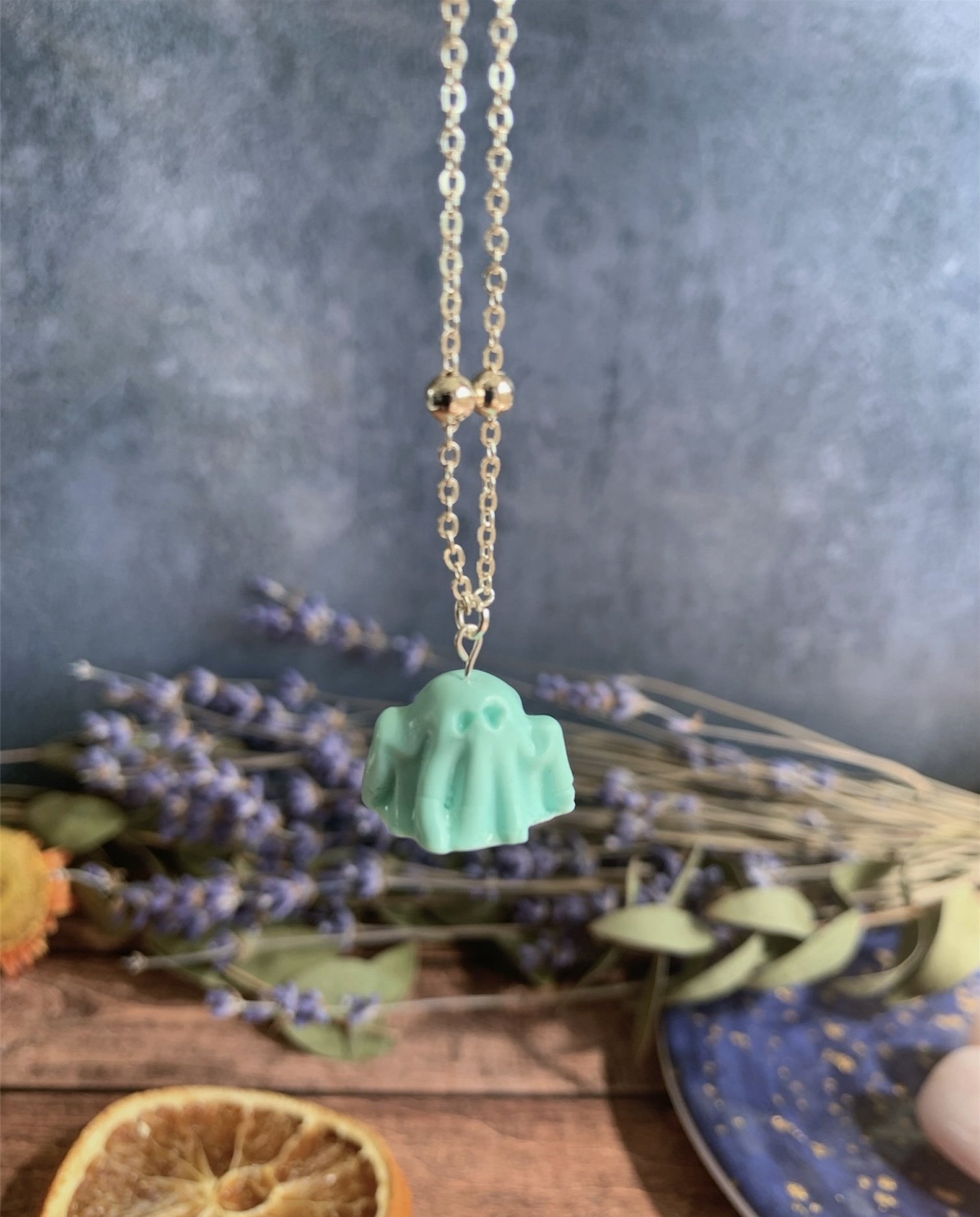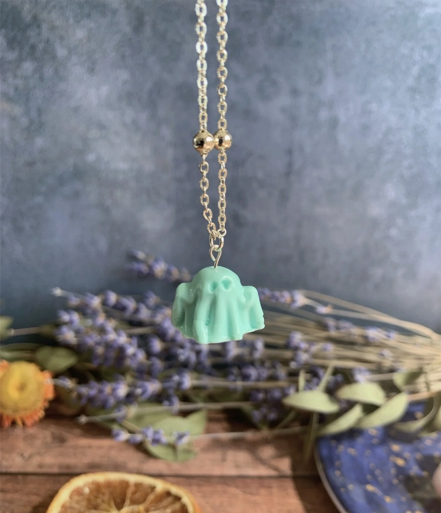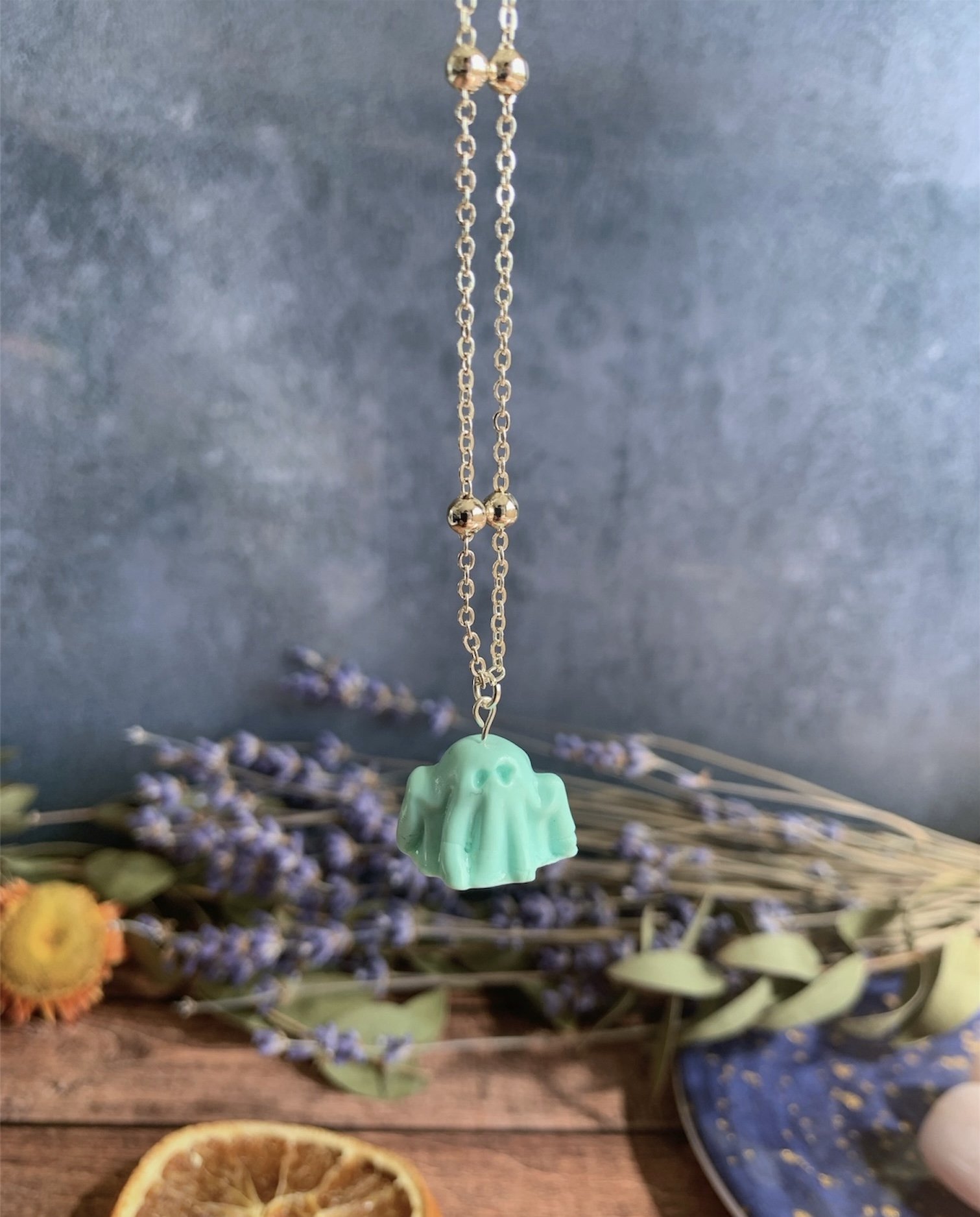This adorable necklace has been made with the most gorgeous Mint Polymer Clay, shaped in to the cutest little spooky ghost. Varnished for a gloss effect. Comes on a Silver Plated 18” Ball Chain. Nickel Free.