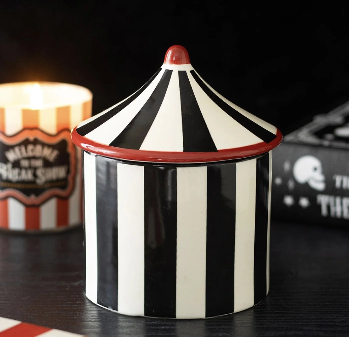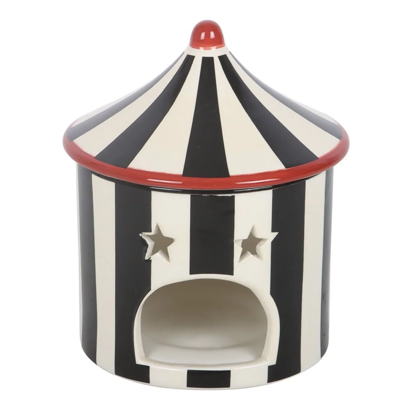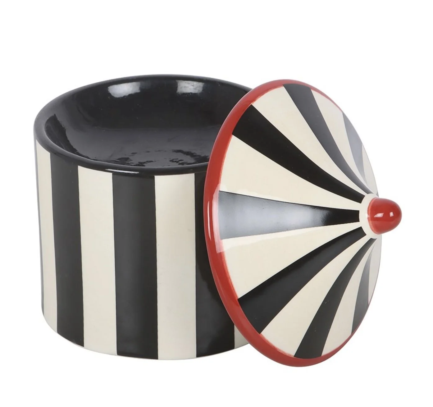 Designed like a twisted circus tent, this ceramic oil burner turns any room into a centre ring of strange and scented delight. Just remove the lid, add diluted fragrance oil to the bowl and light a tealight below to get the show started. Recommended for use with fragrance oil diluted with water. Always remove the lid whilst in use.