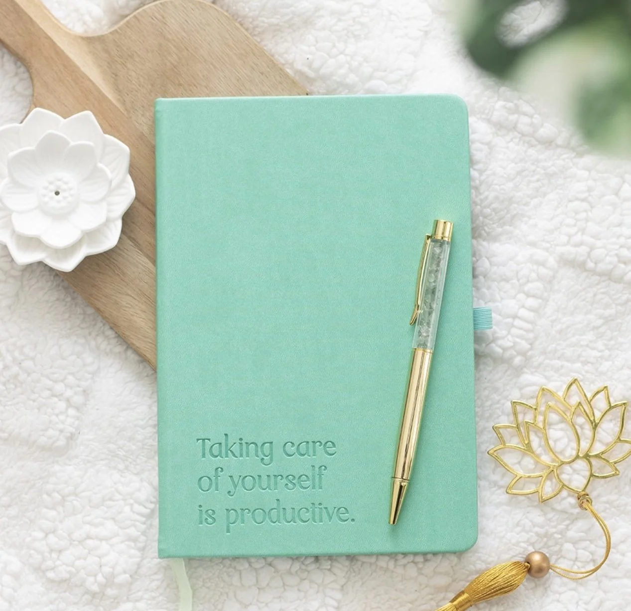Encourage reflection and positive daily habits with this A5 wellness journal, complete with an aventurine crystal pen for an added thoughtful touch. Inside, printed guided pages support gentle morning and evening check-ins and mood tracking, helping to create a consistent and calming self-care routine. Ideal for journalling after yoga practice or setting mindful goals, it makes a meaningful gift for anyone focusing on wellbeing and personal growth.